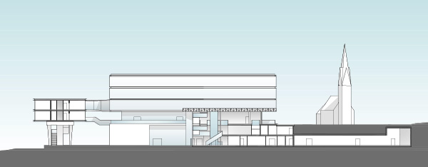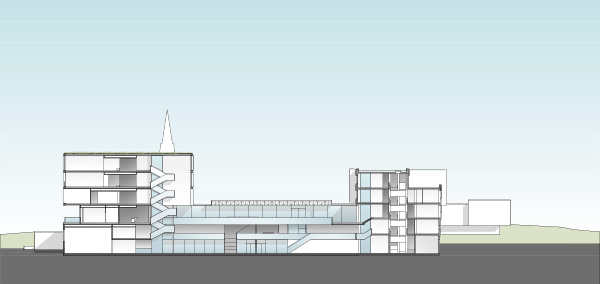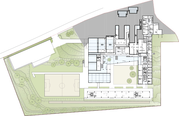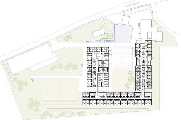 Der natürlichen Topographie des von Norden nach Süden abfallenden Geländes folgend erschließt sich der Nutzungsablauf wie selbstverständlich. Das Niveau des Vorplatzes geht barrierefrei in die Eingangshalle über, im untersten Niveau des zentralen Verteilergebäudes gelangt man direkt in den Innenhof.