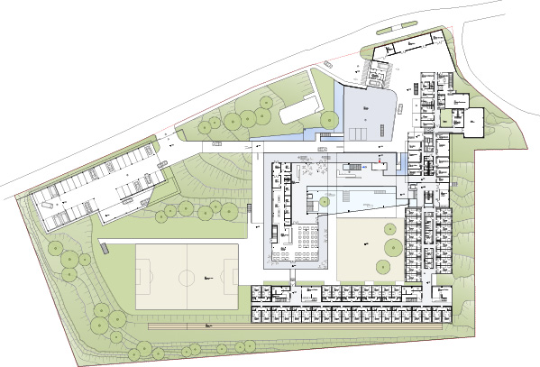 Der östliche Baukörper nimmt mit seinem Betonsockel Bezug auf den Bestandsbau und seiner typischen Betonfertigteilfassade aus den 1970er Jahren, wohingegen der südliche Riegel auf Stützen aufgeständert ist und den Innenhof in die Landschaft fließen lässt. Sowohl der Hof als auch der Bereich unter dem „schwebenden“ Bauteil sind körperlichen Ertüchtigung gewidmet. In Einklang mit einem ausgefeilten Bepflanzungskonzept sind die Außentrainingsflächen mit Trainingsgeräten bestückt, Sitzstufen leiten zur Laufbahn und in weiterer Folge in die Landschaft.